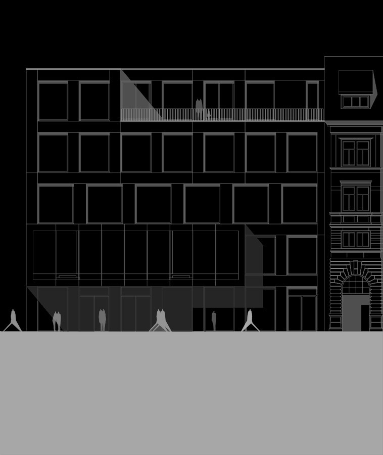 bezugnehmend auf die unterschiedlichen stadträumlichen gegebenheiten und die neuen städtebaulichen und gestalterischen funktionen, wurde in diesem verhältnis und proportionen – wandanteil zu glas – die baukörperfigur, eine große skulptur, ein gesamtvolumen, aus welchem einzelvolumen heraus- und hinzugenommen wurden, entwickelt. trauf- und firstlinien der nachbargebäude werden im bauwerk aufgenommen und weitergeführt. analog dem ehemaligen postgebäude, der heutigen sparkasse bodensee, mit der eckbetonung als turm, die den abschluss des bahnhofsplatzes markiert, wird der neue baukörper des sporthauses an der ecke zur bodanstraße erhöht und bildet nun einen markanten städtischen abschluss des bahnhofsplatzes. aus dem eingang heraus entwickelt sich die stadtloggia, ein großes, offenes volumen, ein erker, der aus der sonstigen gebäudegestaltung heraustritt und die räume, das innere des bauwerks, der skulptur, zum stadtraum, zum boulevard, zum see öffnet. die aussen- und innenwände sind in sichtbeton mit unterschiedlichen oberflächen ausgeführt. der beton der aussenfassade wurde mit ausgesuchten zuschlagsstoffen d.h. mit schwarzen, grünen, braunen und beigen steinen vermischt und die oberfläche steinmetzmäßig gestockt und schariert, so dass eine bewegte, weiche oberfläche mit graubrauner farbe entsteht. die profile der verglasungen und türen wurden in baubronze ausgeführt als reminiszenz an die häuser der jahrhundertwende. an der aussenkante zum innenraum wechselt der beton zum glatten grauen sichtbeton, der in den innenraum, an den wänden, böden und decken fortgeführt wird. die deckenflächen wurden zusätzlich silber lackiert, was den innenräumen einen zusätzlichen glanz verleiht und lichtreflexe von aussen nach innen und innen nach aussen zuläßt. im inneraum entwickeln sich sieben gestapelte geschosse, fünf verkaufsgeschosse, ein geschoss für ausstellung und verwaltung und ein wohngeschoss, meist fast quadratische räume mit stattlicher raumhöhe, ohne abgehängte decken oder verkleidungen, mit sichtbarer betontragkonstruktion der aussenwände und vier stützen im zentralbereich. zur aussenfassade bahnhofsplatz orientiert, entwickelt sich die freitragende treppe über die geschosse mit ihren lufträumen, zeigt im innenraum die gesamthöhe, verbindet, gibt einblicke in die geschosse und ausblicke in die urbane stadt. das entwickelte gefüge und die architektur des sporthauses zum see gibt dem bahnhofsplatz in konstanz einen südlichen, städtbaulichen abschluß des boulevards. durch die massivität der großflächigen wandflächen und der transparenz der glasfassaden entsteht ein kontrast aus stabilität und dynamik und die notwendige beziehung zu den historischen nachbargebäuden.