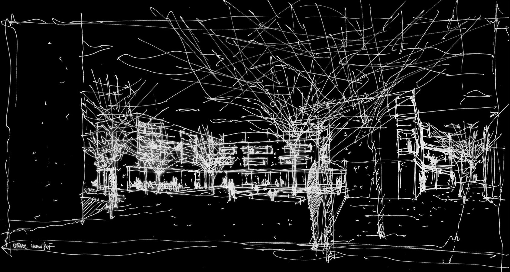 abgeleitet aus der umgebenden städtebaulichen struktur inszenieren die freiflächen im innern den kontrast zur umgebenden steinernen stadt mit einem dichten floral geprägten garten. umspielt von filigranen kirschhainen wechseln in einem leicht fraktalen spiel, befestigte flächen für terrassen, zuwege und stellplätze, mit gärtnerischen themen wie rasen, stauden oder einem kontemplativen wasserspiel, abgeleitet aus dem historischen vorhandenen wasserlauf an dieser stelle, ab und verweben sich zu einem urbanen gartenbild von dezenter farbigkeit.