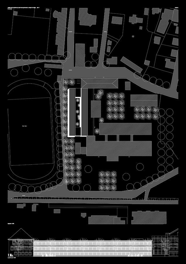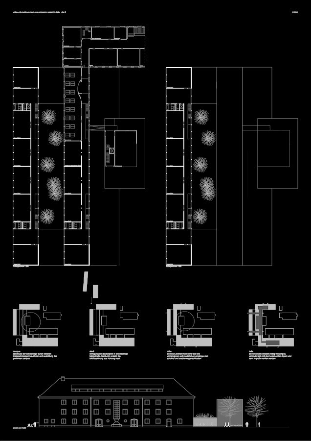 zwischen dem historischen schulgebäude und der kaufmännischen schule wird das neue bauwerk in die raumfuge eingeschoben. durch die ausbildung einer zentralen halle, integration der bestehenden funktionen, sowie die horizontalen und vertikalen gliederungen des neuen baukörpers, wird das komplette schulensemble übersichtlich, großzügig und funktional schlüssig. der nördliche abschluss zum stadionweg wird analog den bestehenden hauptbaukörpern als dreigeschossiger kubus vorgeschlagen,welcher einerseits aus dem stadtraum der liebigstraße/ stadt erkennbar wird, andererseits den leitgedanken campus unterstützt und die halle als zentralen platz, treffpunkt, welche durch die u-förmige bebauung eingefasst wird und sich zum schulhof öffnet, definiert.