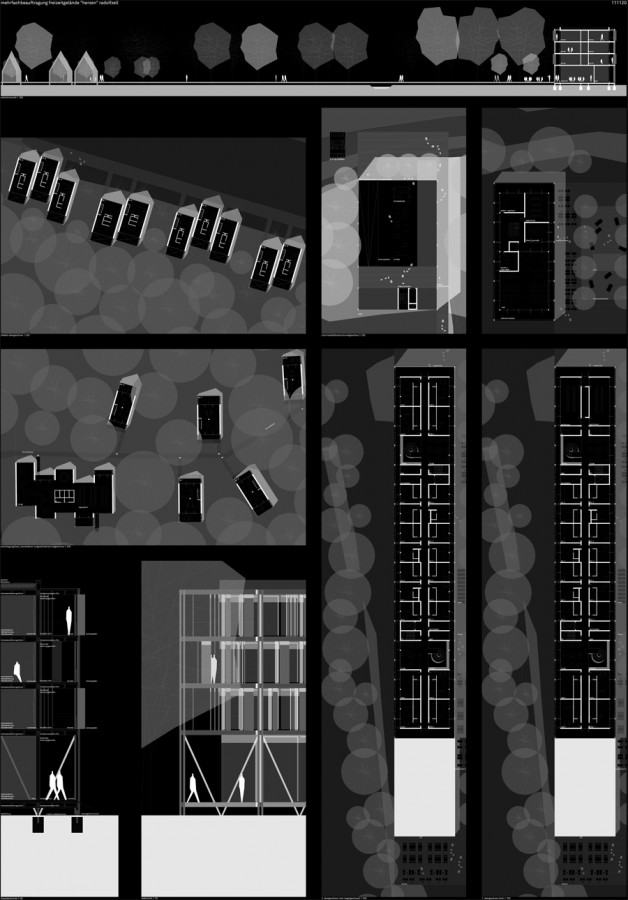 die luftgeschosse werden mit einem sichtbetonstützenraster mit unterzugsfachwerk konzipiert, auf welchem der dreigeschossige hotelbaukörper als holzbau aufgelegt ist, der mit einem vorbewitterten holzstabwerk ummantelt wird.