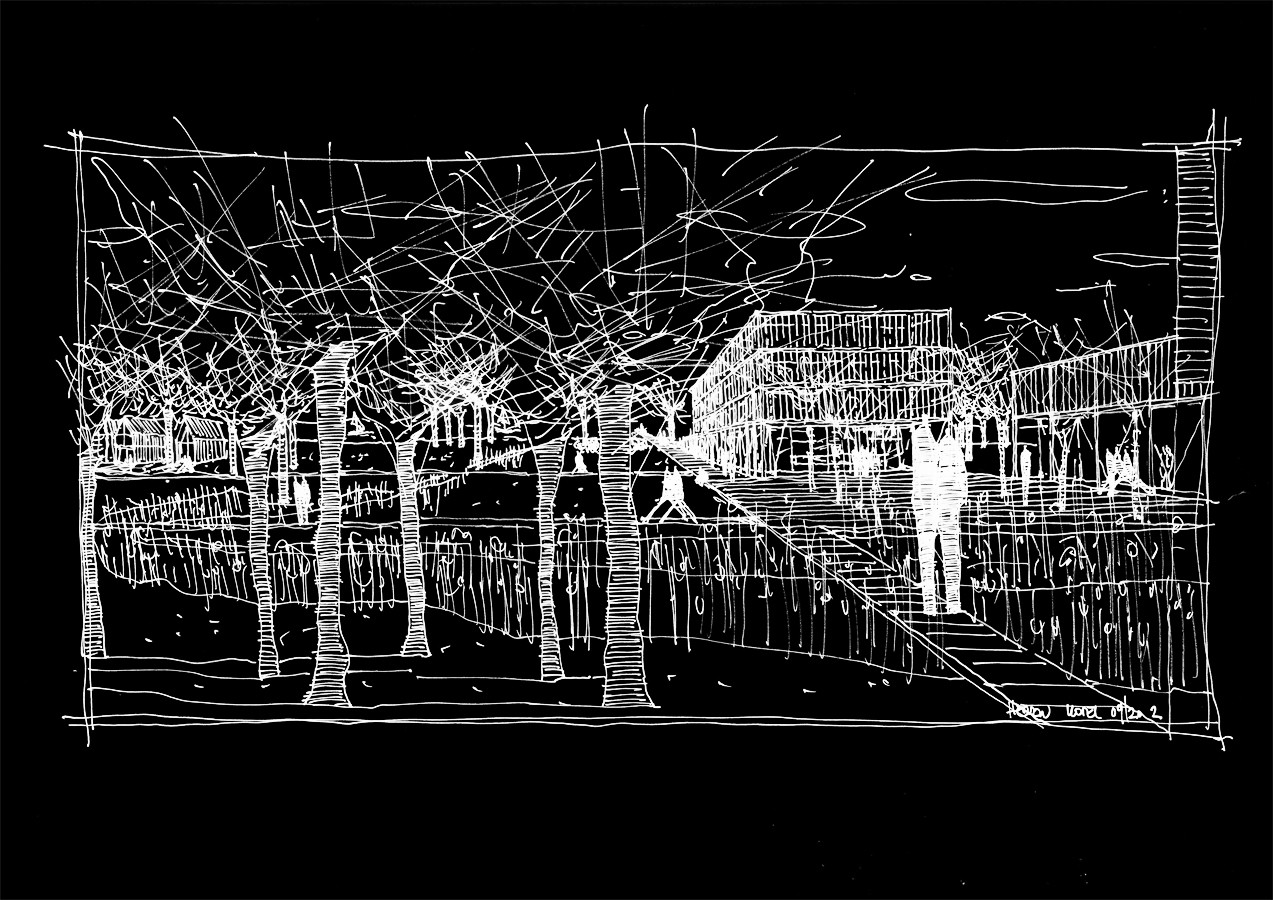 die existierenden groß - und kleingebäude am ufer sind in ihrem gesamtvolumen kompakte, wohltuend einfache, in sich geschlossene, auch bewegte aber geometrische baukörper.