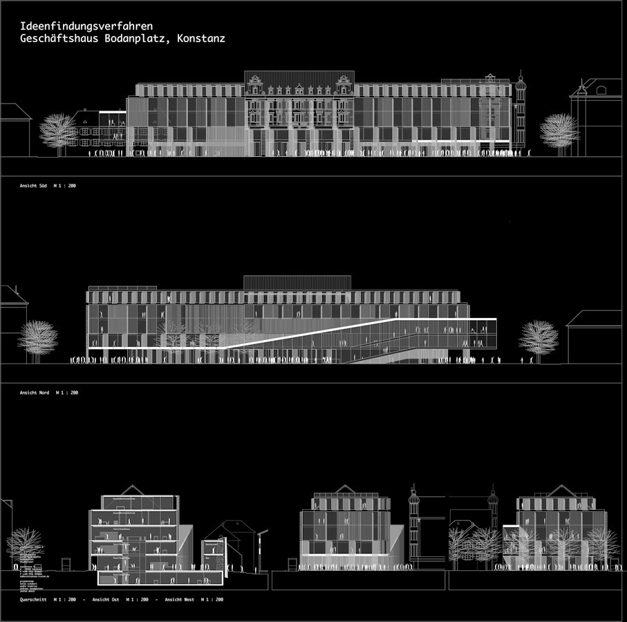 Auf dem Planungsareal entwickelt sich zwischen Bodanplatz, Bodanstrasse, Rosgartenstrasse und Bruderturmgasse eine differenzierte städtebauliche Struktur mit klar formulierten, in Zusammenhang stehenden Plätzen und neuen Wegbeziehungen. Der Bodanplatz als Gesamtsituation wird als grosser stadträumlicher Platz über die Bodanstrasse hinweg entwickelt. Die bestehenden Plätze, Alte Sparkasse, Löwenplatz, bisheriger Bodanplatz werden zusammengefasst und über den Strassenraum bis zur historischen Stadtmauer gelegt. Der neue Platz reicht von der Bruderturmgasse bis zum Bahnhofsplatz und von der Stadtmauer bis zur Wiesenstrasse. Durch die Öffnung und Integration sämtlicher Funktionen auf den Platz und nicht auf eine Strasse, können sich die beiden Innenstadtgefüge Stadelhofen und Neugassenviertel räumlich, gestalterisch und ökonomisch verbinden. Analog historischer Beispiele der Stadtentwicklung, Konzil (Kaufhaus), Markthäuser (Kaufhaus),... stehen auf dem Platz zwei Gebäudeensemble. Zum Einen die bestehende Gebäudeinsel nahe dem Seeuferhaus, zum Anderen das neue Geschäftshaus auf dem Bodanplatz als Möbel, als Platzdifferenzierung und Platzkantenbildung. Das neue Geschäftshaus auf dem Bodanplatz wird als eigenständiges Gesamthaus entwickelt, welches als "Einhaus" erkennbar ist, jedoch auf die unterschiedlichen, wichtigen stadträumlichen Gegebenheiten eingeht und diese in Ihrer Funktion unterstützt. Das Gebäude zeigt sich als im Platzraum offenes Gebäude, in welchem der Platzbelag durch den Innenraum hindurchläuft. Die Fassaden sind als zweischichtiges Netzwerk mit unterschiedlichen vertikalen und horizontalen Gliederungen aufgebaut und integrieren den bestehenden Baukörper optimal. Dem transparenten Gebäude aus verschiedenen Glasarten, wird eine zweite Schicht mit Faltstrukturen aus Kupfermetall und Edelstahl zum Schliessen der Fassaden vorgestellt. Es entsteht ein dynamischen Haus, ein Haus welches verändert werden kann, geöffnet, halbgeöffnet, geschlossen, ein Haus das die Stadtteile entwickelt und verbindet. Nach Süden wird die Fassade analog dem bestehenden Gebäude viergeschossig mit Dachgeschossgeschoss sichtbar. Zur Rosgartenstrasse springt die Fassade im Erdgeschoss zurück und bildet den Haupteingang zum grossen Textilkaufhaus aus. Die historische Stadtmauer wird freigelegt. An dieser entlang wird eine neue Wegebeziehung über den Platz, Geschäftshaus, Rosgartenstrasse, Bruderturmgasse, Neugasse angeboten. Die Höhenentwicklung des neuen Gebäudes reagiert auf die kleinstrukturierte Bebauung um die Stadtmauer und steigert deren Stimmung mit neuen, im Maßstab subtilen Gebäudeelementen. Aus der Erdgeschossebene erweitert sich eine zwei- bis dreigeschossige Ladenzeile als eigenständige Geschäftseinheit oder im Textilhaus integriert. Dieser Baukörper kragt in Richtung Bruderturmgasse aus und bildet den städtebaulichen Abschluss an der Westseite. Als in den Platz hineinragendes Bauwerk, analog den bestehenden Gebäude, Rotes Haus und Sporthaus Gruner wird hier ein Triptychon gebildet. Es entsteht eine neue Platzgasse mit einer Verlängerung der Fassadenkante des Schuhhaus König, mit neuen Ladengeschäften und einem Restaurant, in welchen die Stadtmauer in der Gesamthöhe sichtbar bleibt. Über ein bestehendes Gebäude in der Neugasse wird der neue Stadtraum ebenfalls erschlossen und verbindet sich mit diesem am neuen Restaurant. Durch die Gesamtkonzeption und die Fassadengestaltung mit hochwertigen und veredelten Materialien, wird ein Gebäude mit grosser Wertigkeit vorgeschlagen. Das geforderte Raumprogramm mit grossem Textilhaus, Kleinläden und Gesundheitszentrum wird komplett erfüllt und durch zwei zentrale Erschliessungen optimal erschlossen.