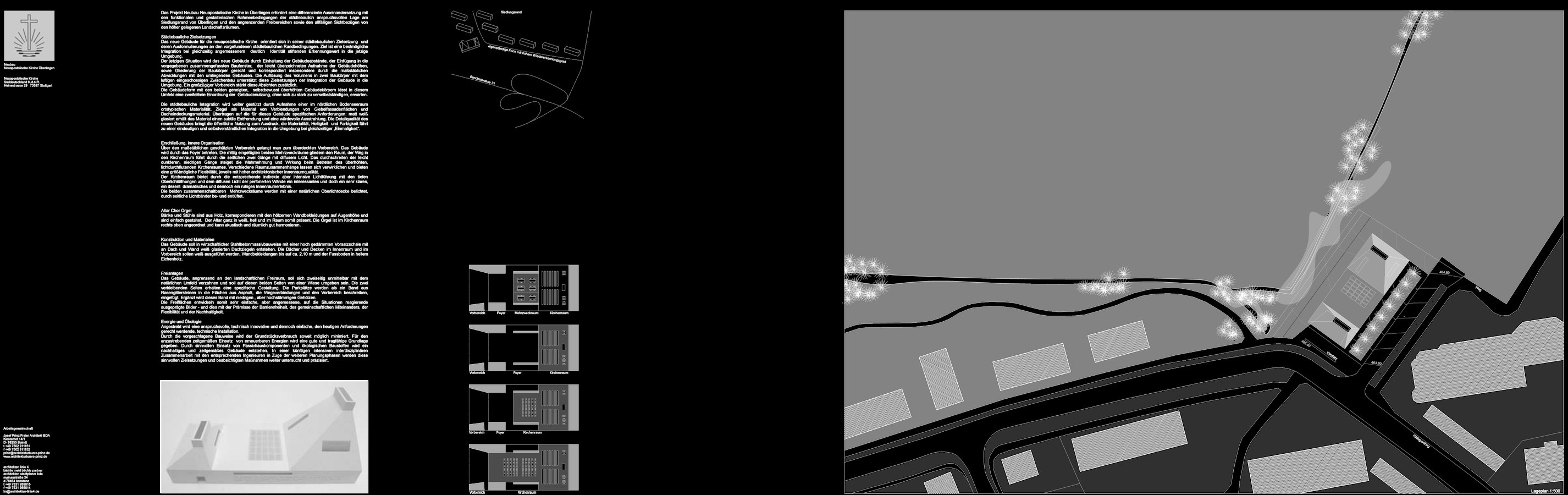 Das neue Gebäude für die neuapostolische Kirche orientiert sich in seiner städtebaulichen Zielsetzung und deren Ausformulierungen an den vorgefundenen städtebaulichen Randbedingungen. Ziel ist eine bestmögliche Integration bei gleichzeitig angemessenem deutlich Identität stiftenden Erkennungswert in die jetzige Umgebung. Der jetzigen Situation wird das neue Gebäude durch Einhaltung der Gebäudeabstände, der Einfügung in die vorgegebenen zusammengefassten Baufenster, der leicht überzeichneten Aufnahme der Gebäudehöhen, sowie Gliederung der Baukörper gerecht und korrespondiert insbesondere durch die maßstäblichen Abwicklungen mit den umliegenden Gebäuden. Die Auflösung des Volumens in zwei Baukörper mit dem luftigen eingeschossigen Zwischenbau unterstützt diese Zielsetzungen der Integration der Gebäude in die Umgebung. Ein großzügiger Vorbereich stärkt diese Absichten zusätzlich. Die Gebäudeform mit den beiden geneigten, selbstbewusst überhöhten Gebäudekörpern lässt in diesem Umfeld eine zweifelfreie Einordnung der Gebäudenutzung, ohne sich zu stark zu verselbstständigen, erwarten. Die städtebauliche Integration wird weiter gestützt durch Aufnahme einer im nördlichen Bodenseeraum ortstypischen Materialität. Ziegel als Material von Verblendungen von Giebelfassadenflächen und Dacheindeckungsmaterial. Übertragen auf die für dieses Gebäude spezifischen Anforderungen: matt weiß glasiert erhält das Material einen subtile Entfremdung und eine würdevolle Ausstrahlung. Die Detailqualität des neuen Gebäudes bringt die öffentliche Nutzung zum Ausdruck, die Materialität, Helligkeit und Farbigkeit führt zu einer eindeutigen und selbstverständlichen Integration in die Umgebung bei gleichzeitiger „Einmaligkeit“.