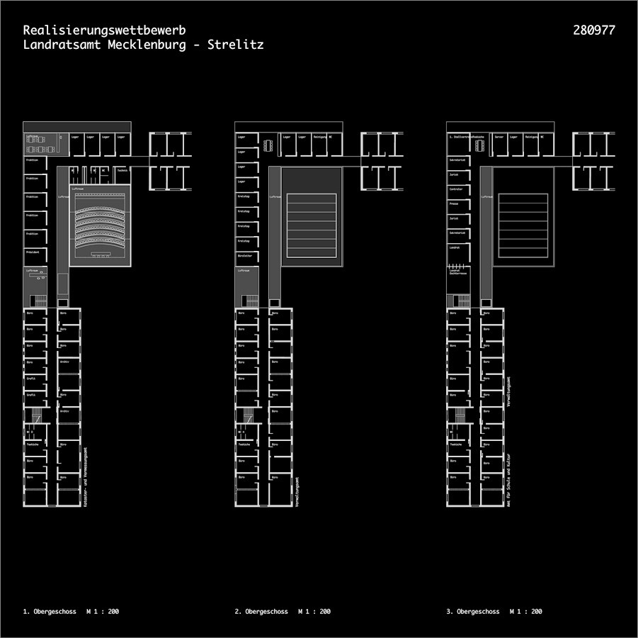 Die bisher erfolgten Sanierungsarbeiten des Landratsamtes Mecklenburg Strelitz sollen mit der Sanierung des Gebäudes 6 und einem Neubau mit Haupteingang, Flächen für den Kreistag, Kantine, Sitz des Landrats und verschiedenen Verwaltungen, ergänzt und komplettiert werden.Das Wettbewerbsgebiet liegt in zentraler Lage zwischen den bereits sanierten Gebäuden und dem Gebäude 6, als Gelenk eines L-förmigen Baukörpers.Das neue Bauwerk wird nicht als Glied zwischen die bestehenden Gebäude eingepasst, sondern entwickelt, unter Einbindung des Gebäudes 6, einen eingenständigen langgestreckten Körper der mit Verbindungsgang an das sanierte Haus 1 angebunden wird.Im Gegensatz zu den bestehenden in weiten Teilen geschlossenen Baukörpern, wird der Neubau als offenes, öffentliches Gebäude entworfen.Das neue Haus zeigt sich als transparente, einbündige Anlage, die sich als Winkel zum Haus 1 richtet.Die Winkelform wird aus der Ecksituation weitergeführt.Der Endpunkt des Mäanders wird durch den Kreistagssaal gebildet, der an der Nahtstelle zu- Gebäude 6 den Haupteingang definiert.