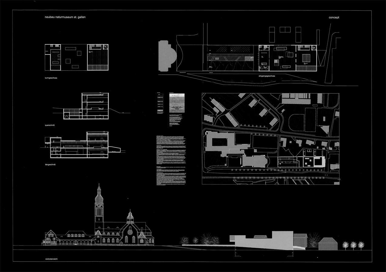 das bauprojekt neuebau naturmuseum in st.gallen erfordert eine differenzierte auseinandersetzung mit den funktionalen und gestalterischen rahmenbedingungen des ortsbaulich sensiblen ortes mit den umliegenden gebäuden und topographien, insbesondere mit dem eindrucksvollen schutzobjekt kirche st.maria neudorf. der entwurf beabsichtigt, die vorgefundenen hohen qualitäten und bezüge des ortes respektvoll aufzunehmen, in ihrer bedeutung klar zu definieren und zu steigern sowie die störenden einflüsse wie verkehrlärm von der rorschacher strasse und der autobahn zu minimieren. durch die situierung des neuen gebäudes in verlängerung und in angelehnter proportion zur kirche st.maria wird der ort und platz mit kirche nach nordwesten fortgeführt und in der höhenentwicklung des gebäudes nochmals untermauert nach nordwesten abgeschlossen und gerahmt kirche und museum sollen in dem entlang der rorschacherstrasse ortsbaulichen heterogen gebiet am übergang vom städtischen siedlungsgebiet zum landschaftlichen goidachbereich eine starke identitätsstiftende ensemblewirkung erhalten. unterstützt wird diese zielsetzung durch eine an der kirche orientieten materialität und subtile farbigkeit des gestockten sichtbetons.
