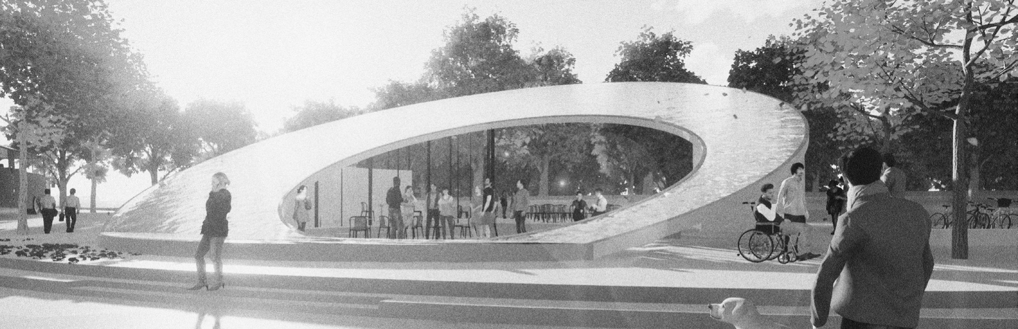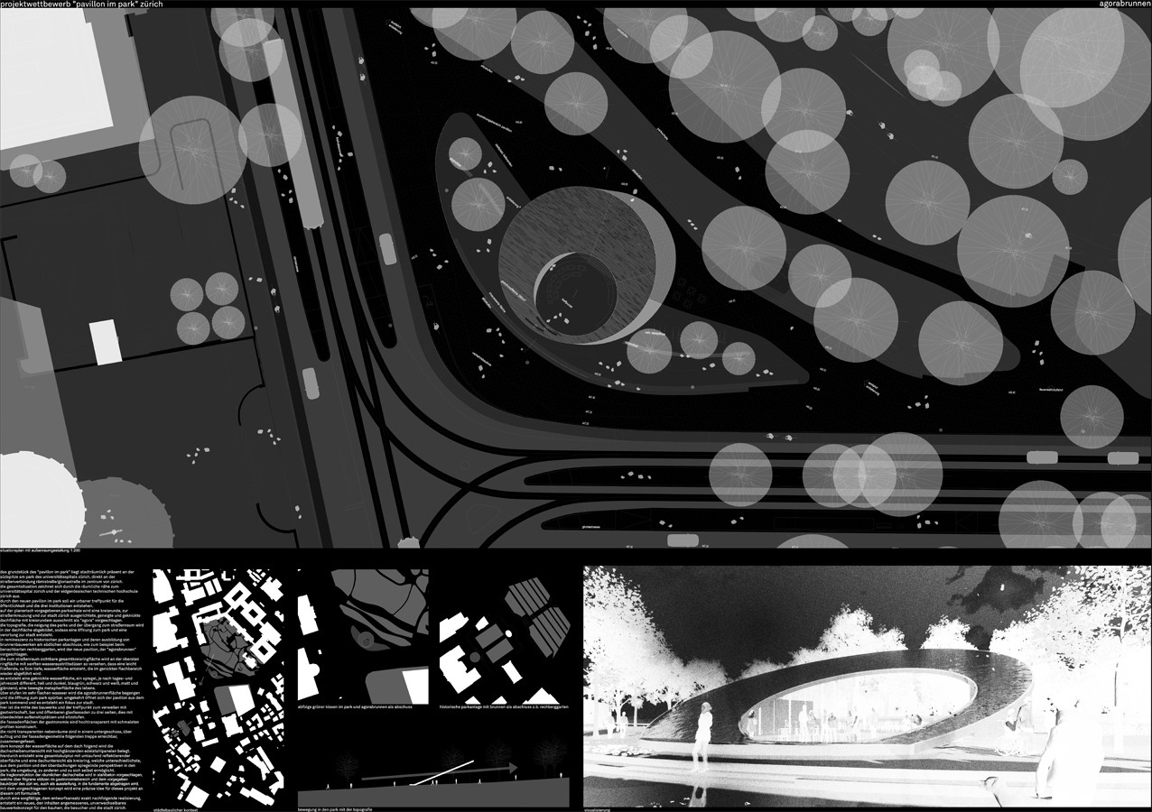 das grundstück des «pavillon im park» liegt stadträumlich präsent an der südspitze am park des universitätsspitals zürich, direkt an der straßenverbindung rämistraße/gloriastraße im zentrum von zürich. die gesamtsituation zeichnet sich durch die räumliche nähe zum universitätsspital zürich und der eidgenössischen technischen hochschule zürich aus. durch den neuen pavillon im park soll ein urbaner treffpunkt für die öffentlichkeit und die drei institutionen entstehen. auf der planerisch vorgegebenen parkschale wird eine kreisrunde, zur straßenkreuzung und zur stadt zürich ausgerichtete, geneigte und geknickte dachfläche mit kreisrundem ausschnitt als «agora» vorgeschlagen. die topografie, die neigung des parks und der übergang zum straßenraum wird in der dachfläche abgebildet, sodass eine öffnung zum park und eine verortung zur stadt entsteht. in remineszenz zu historischen parkanlagen und deren ausbildung von brunnenbauwerken am südlichen abschluss, wie zum beispiel beim benachbarten rechberggarten, wird der neue pavillon, der «agorabrunnen» vorgeschlagen. die zum straßenraum sichtbare gesamtkreisringfläche wird an der obersten ringfläche mit sanften wasseraustrittsdüsen so versehen, dass eine leicht fließende, ca 5cm tiefe, wasserfläche entsteht, die im genickten flachbereich wieder abgeführt wird. es entsteht eine geknickte wasserfläche, ein spiegel, je nach tages- und jahreszeit different, hell und dunkel, blaugrün, schwarz und weiß, matt und glänzend, eine bewegte metapherfläche des lebens. über stufen im sehr flachen wassser wird die agorabrunnenfläche begangen und die öffnung zum park spürbar. umgekehrt öffnet sich der pavillon aus dem park kommend und es entsteht ein fokus zur stadt. hier ist die mitte des bauwerks und der treffpunkt zum verweilen mit gastwirtschaft, bar und öffenbaren glasfassaden zu drei seiten, dies mit überdeckten außensitzplätzen und sitzstufen. die fassadenflächen der gastronomie sind hochtransparent mit schmalsten profilen konstruiert. die nicht transparenten nebenräume sind in einem untergeschoss, über aufzug und der fassadengeometrie folgenden treppe erreichbar, zusammengefasst. dem konzept der wasserfläche auf dem dach folgend wird die dachscheibenuntersicht mit hochglänzenden edelstahlpanelen belegt. hierdurch entsteht eine gesamtskulptur mit umlaufend reflektierender oberfläche und eine dachuntersicht als kreisring, welche unterschiedlichste, aus dem pavillon und den überdachungen spiegelnde perspektiven in den park, die umgebung, zu anderen und zu sich selbst ermöglicht. die tragkonstruktion der räumlichen dachscheibe wird in stahlbeton vorgeschlagen, welche über filigrane stützen im gastronomiebereich und dem vorgegeben baukörper des züri wc, auch als aussteifung, in die fundamente abgetragen wird. mit dem vorgeschlagenen konzept wird eine präzise idee für dieses projekt an diesem ort formuliert. durch eine sorgfältige, dem entwurfsansatz exakt nachfolgende realisierung, entsteht ein neues, den inhalten angemessenes, unverwechselbares bauwerkskonzept für den bauherr, die besucher und die stadt zürich.
