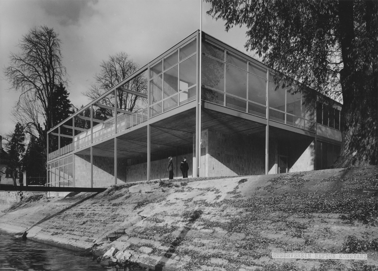 revitalisierung und erweiterung denkmalgeschütztes clubhaus neptun aus dem jahre 1956 des bauhausschülers architekt herrmann blomeier. die vorgeschlagene erweiterung knüpft an das konzept des ursprünglich geplanten zweiten bauabschnittes an und bietet eine neue respektvolle architektur an, dies in material, form und farbe im sinne herrmann blomeiers. zur spanierstraße entsteht eine adequate neue clubadresse mit neuer bootshalle im erdgeschoss und club- und gastronomieflächen im obergeschoss.