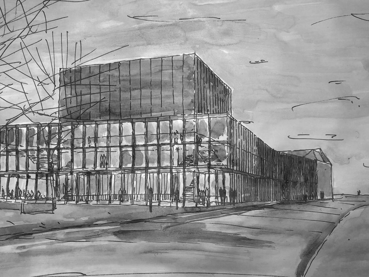 das gebäude wird in einem farbraum entworfen, der aus den materialien der bestandsgebäude entwickelt wurde, in hellen beige-grau tönen.