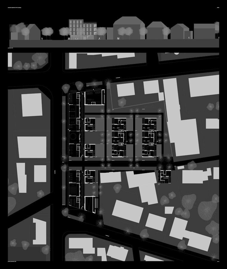 die vorgefundene blockrandbebauung zeigt eine in maß und höhe heterogene bebauung mit zwei bis viergeschossigen baukörpern und dachgeschossen. an der ziegelstraße sowie an den anschlüssen zur rudolfstraße und zwergerstraße wird der blockrand fortgeführt und geschlossen. die ziegelstraße wird durch eine viergeschossige randbebauung in zwei baukörpern mit regelmäßigen, wiederkehrenden kopfaufbauten als dachaufbau gegliedert. an der rudolfstraße wird die viergeschossige bebauung fortgeführt und an der zwergerstraße geschieht dies ebenfalls, jedoch zur niedrigen zweigeschossigen nachbarbebauung um ein geschoss abgestaffelt, sodass ein dreigeschossiger anschluss entsteht. aus dem ordnungsprinzip der blockrandtypologie werden die hofhäuser - pavillons- weiterentwickelt. diese werden als dreigeschossige baukörper mit dachaufbau vorgeschlagen. die dem wohnen vorbehaltenen ruhigen innenhofbebauungen gliedern sich zum einen an die blockrandstrukuren an, zum anderen stehen diese als freistehende neue bauwerke im innenhof in weiterführung der vorgefundenen nordsüd stehenden bestandsgebäude. entlang der bestehenden innenhofeinzelhäuser in ostwestrichtung wird weiterhin ein neuer baukörper eingefügt der die körnung dieser achse aufnimmt und diese im quartier fortführt.