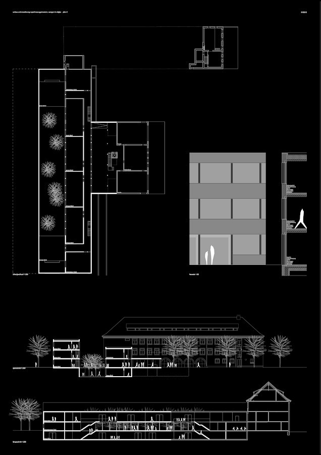sämtliche bestandsgebäude bleiben bestehen. der fischerbau wird in den neubau integriert und umgebaut, hierbei kann die haustechnik und die meisten fassaden erhalten bleiben. die neu sanierten innenräume des lehrerzimmers werden lediglich peripher umgebaut, bleiben in ihrer struktur bestehen und werden um einen großen raum erweitert. das schulgebäude von 1996 wird aus wirtschaftlichen gründen nicht verändert, könnte bei wunsch jedoch auch in den neubau integriert werden.
