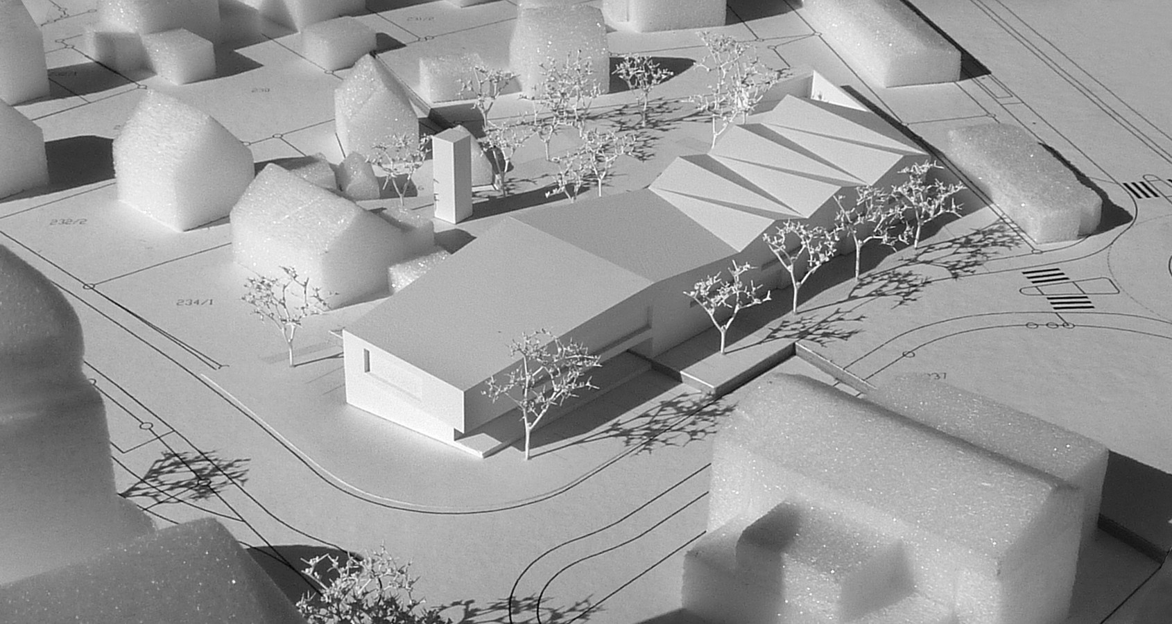 das baugrundstück wird durch die lage und anbindung der zur stadtmitte orientierten wilhelmstraße, der unmittelbaren nähe zur sankt gallus kirche mit seinen kirchengemeindegebäuden und den wegeverbindungen zur altstadt geprägt. das neue kinderhaus wird so platziert, dass die bestehende bebauung ergänzt und zum neuen strassenraum des kreisverkehrs gefasst wird. ein stadträumliches quartier entsteht. als weiterer baustein der wilhelmstraße reiht sich der neue baukörper als öffentliches gebäude in die städtebauliche gebäudegliederung zwischen wohnbebauung und postgebäude ein. großzügig öffnet sich der zugangsbereich zum öffentlichen raum. vorplatz, gehweg und parken verschmelzen durch einen einheitlichen plattenbelag zu einer einladenden wie sichernden geste.