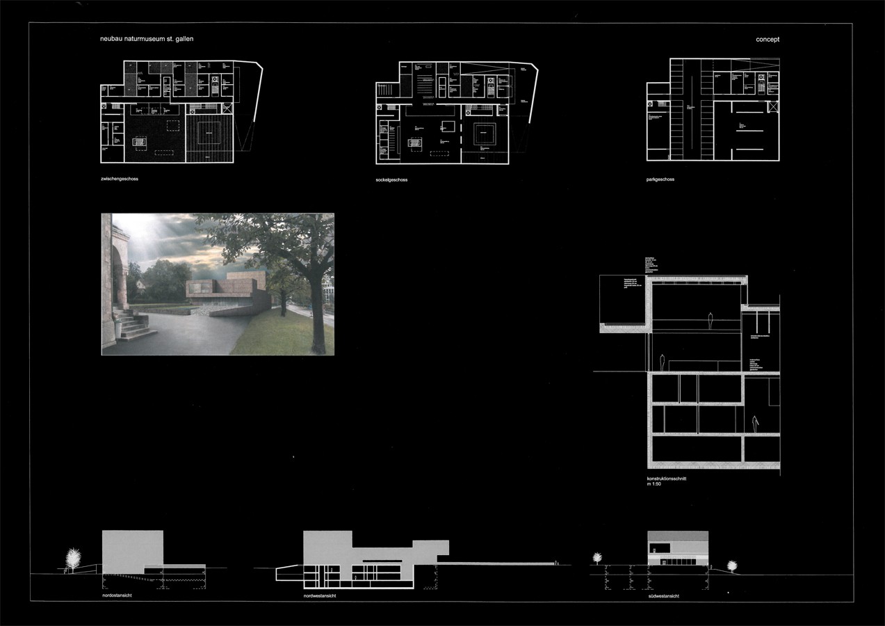 das bauprojekt neuebau naturmuseum in st.gallen erfordert eine differenzierte auseinandersetzung mit den funktionalen und gestalterischen rahmenbedingungen des ortsbaulich sensiblen ortes mit den umliegenden gebäuden und topographien, insbesondere mit dem eindrucksvollen schutzobjekt kirche st.maria neudorf. der entwurf beabsichtigt, die vorgefundenen hohen qualitäten und bezüge des ortes respektvoll aufzunehmen, in ihrer bedeutung klar zu definieren und zu steigern sowie die störenden einflüsse wie verkehrlärm von der rorschacher strasse und der autobahn zu minimieren. durch die situierung des neuen gebäudes in verlängerung und in angelehnter proportion zur kirche st.maria wird der ort und platz mit kirche nach nordwesten fortgeführt und in der höhenentwicklung des gebäudes nochmals untermauert nach nordwesten abgeschlossen und gerahmt kirche und museum sollen in dem entlang der rorschacherstrasse ortsbaulichen heterogen gebiet am übergang vom städtischen siedlungsgebiet zum landschaftlichen goidachbereich eine starke identitätsstiftende ensemblewirkung erhalten. unterstützt wird diese zielsetzung durch eine an der kirche orientieten materialität und subtile farbigkeit des gestockten sichtbetons.