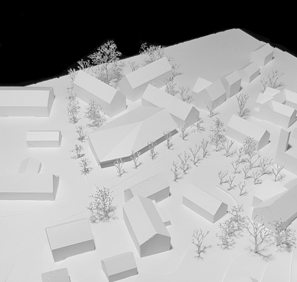 es entstehen drei neue wohnsatteldachgebäude mit differenten geschosszahlen und höhen entsprechend der typographie, welche gemeinsam mit der "marktscheune" eine dörfliche und gleichzeitig moderne typologie aufweisen, mit dem zugang als gasse zu den wohnhäusern im westen und einer gemeinsamen wohnplatzerschließung.