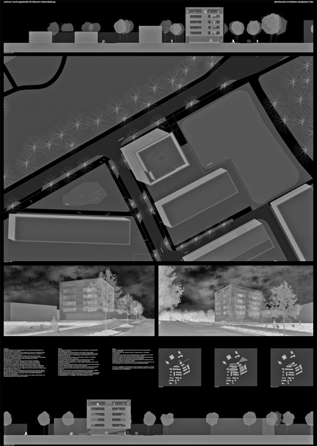 es wird vorgeschlagen ein markantes, präzises, kubisches 6 geschossiges wohnprojekt in massivholzbauweise oder alternativ in massivbauweise, vom gelände durch einen zurückliegenden betonsockel leicht abgehoben auf dem tiefgaragengeschoss, zu errichten.