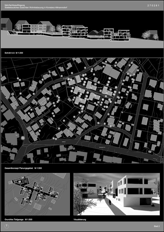 2 geschossige Baukörper mit Dachgeschoss als Splitt Level Grundriß. Monolithischer Kubus mit Akzentuierung und Auskragung als Eingangsüberdachung und in Seerichtung. Differenzierung der Baukörper und Aussenräume, konsequente Abstaffelung und Orientierung der Wohnhöfe zum See. Die Erschließung erfolgt ausschließlich von den Wohnhöfen abgewandt zwischen den Körpern.