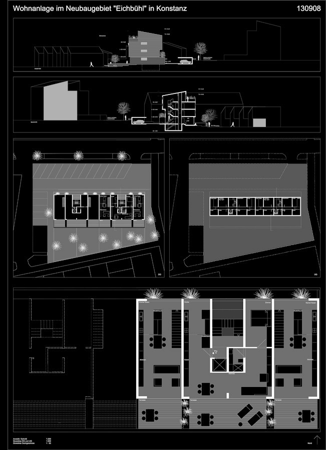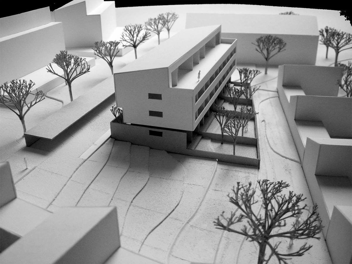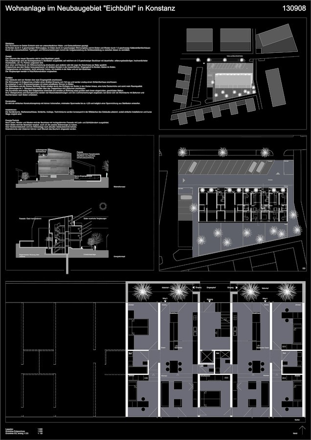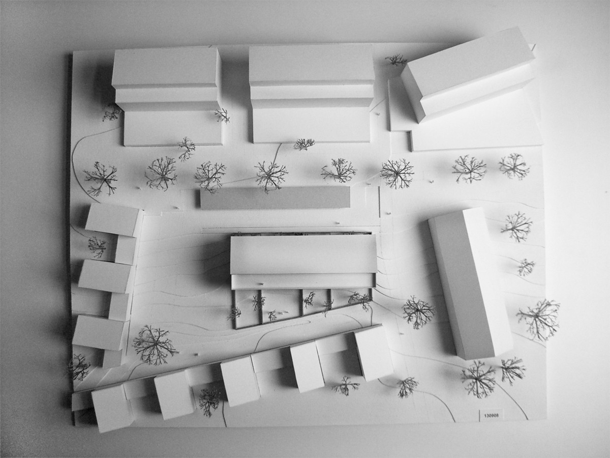 Das Grundstück im Gebiet Eichbühl wird von unterschiedlichen Wohn- und Gebäudeformen geprägt. Im Norden durch 4 -5 geschossigen Wohnungbau, im Osten durch 2-3 geschossigen Wohnungsbau und im Süden und Westen durch 1-2 geschossige Ketteneinfamilienhäuser. Durch die unterschiedlichen Typologien und Höhenentwicklungen kommt der Aufgabenstellung die Schlüsselstellung zu zwischen diesen zu vermitteln.