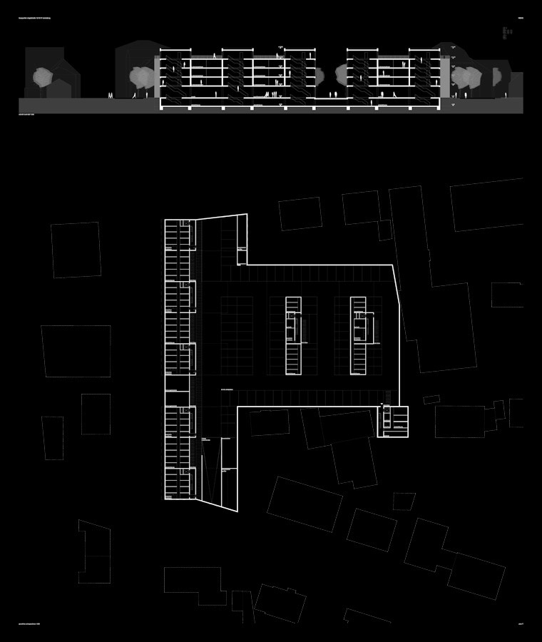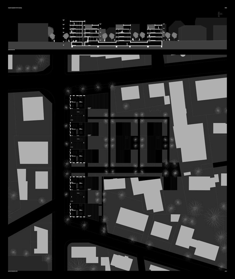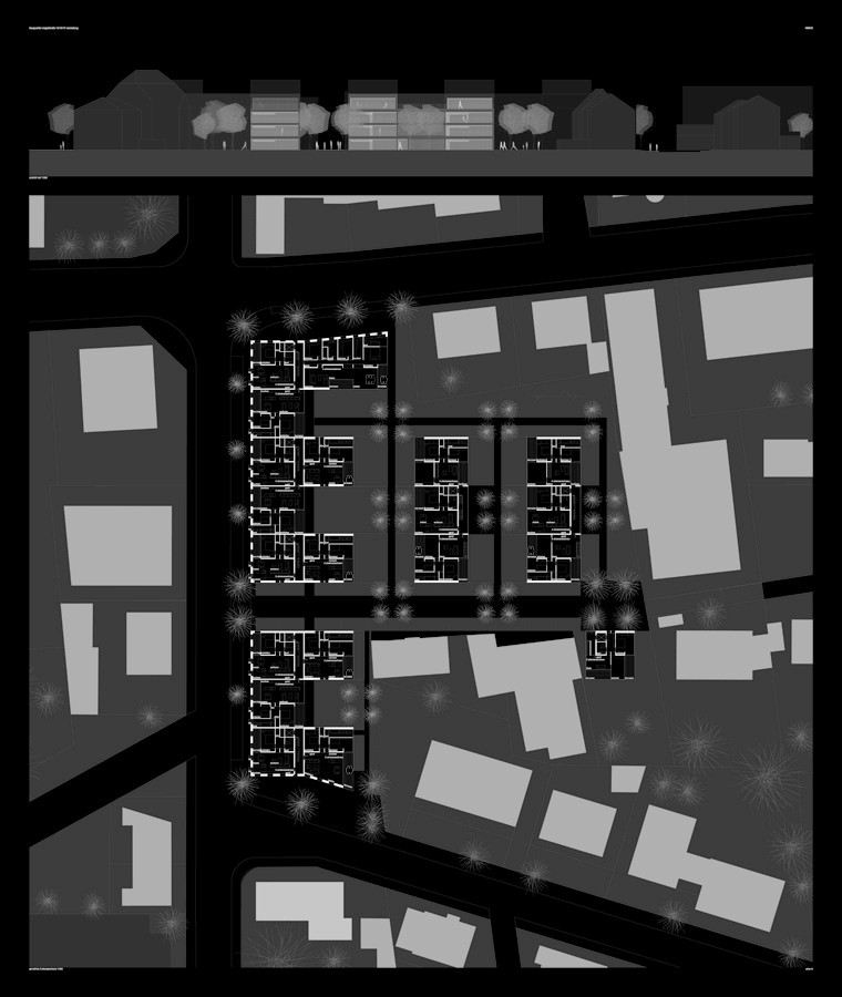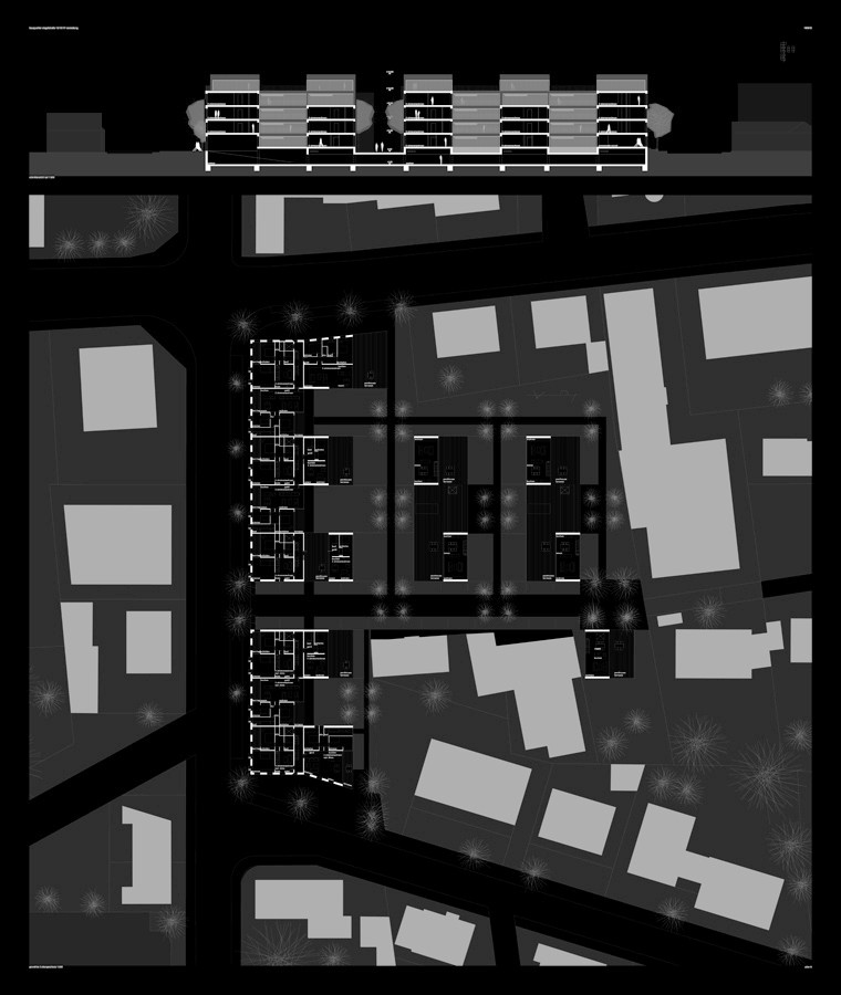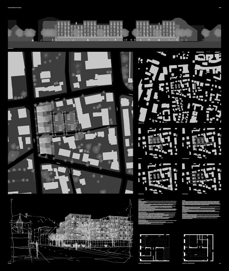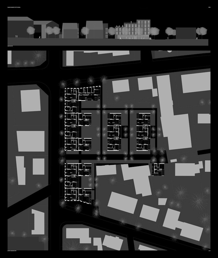 die vorgefundene blockrandbebauung zeigt eine in maß und höhe heterogene bebauung mit zwei bis viergeschossigen baukörpern und dachgeschossen. an der ziegelstraße sowie an den anschlüssen zur rudolfstraße und zwergerstraße wird der blockrand fortgeführt und geschlossen. die ziegelstraße wird durch eine viergeschossige randbebauung in zwei baukörpern mit regelmäßigen, wiederkehrenden kopfaufbauten als dachaufbau gegliedert. an der rudolfstraße wird die viergeschossige bebauung fortgeführt und an der zwergerstraße geschieht dies ebenfalls, jedoch zur niedrigen zweigeschossigen nachbarbebauung um ein geschoss abgestaffelt, sodass ein dreigeschossiger anschluss entsteht. aus dem ordnungsprinzip der blockrandtypologie werden die hofhäuser - pavillons- weiterentwickelt. diese werden als dreigeschossige baukörper mit dachaufbau vorgeschlagen. die dem wohnen vorbehaltenen ruhigen innenhofbebauungen gliedern sich zum einen an die blockrandstrukuren an, zum anderen stehen diese als freistehende neue bauwerke im innenhof in weiterführung der vorgefundenen nordsüd stehenden bestandsgebäude. entlang der bestehenden innenhofeinzelhäuser in ostwestrichtung wird weiterhin ein neuer baukörper eingefügt der die körnung dieser achse aufnimmt und diese im quartier fortführt.